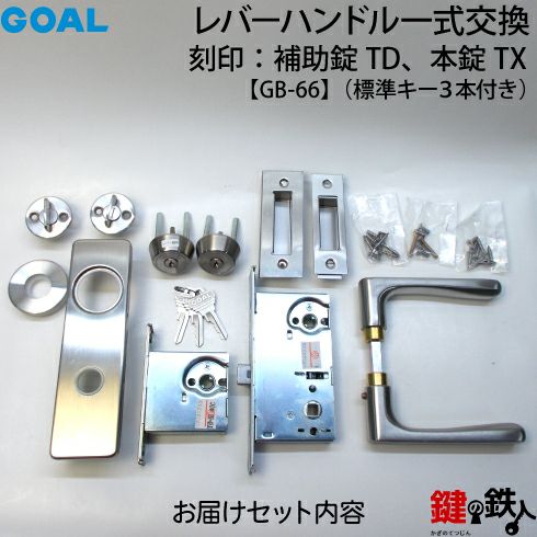 勝手口や玄関ドアのGOAL TXの刻印のレバーハンドル内外、シリンダー、部屋内のサムターン、ドアの中に入っている錠ケース丸ごと一式の交換