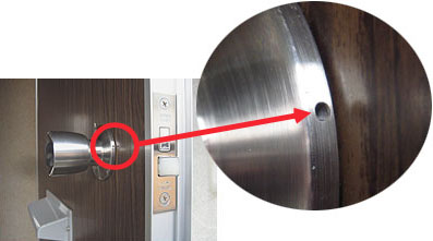 その場合、ドアノブの付け根あたりに直径2~3mmの「穴」があります。この穴にピンを挿しながらローズを回します。