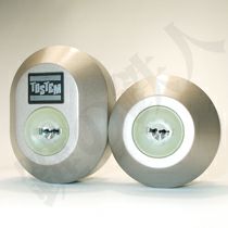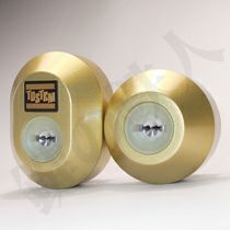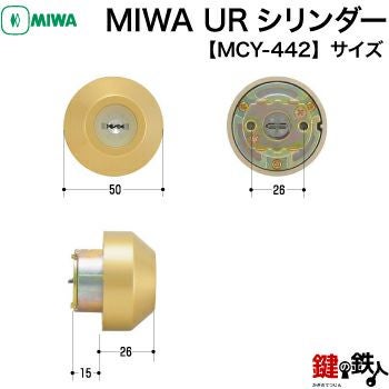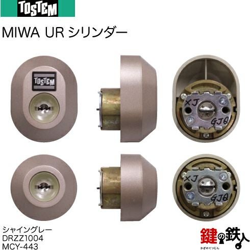 近づいてよく見ると、上が楕円形で下は丸型のシリンダーです。上のシリンダーには、「TOSTEM」というメーカー名が入っています。このタイプのシリンダーは、下記のように6種類のよく似たシリンダーが存在します。よく観察すると、シリンダーの色と厚みが違っていますね。MCY-444とMCY-446は、そっくりですが、ややゴールド色のつや消しタイプがMCY-446です。(間違って購入されても分からないぐらい酷似しています。)