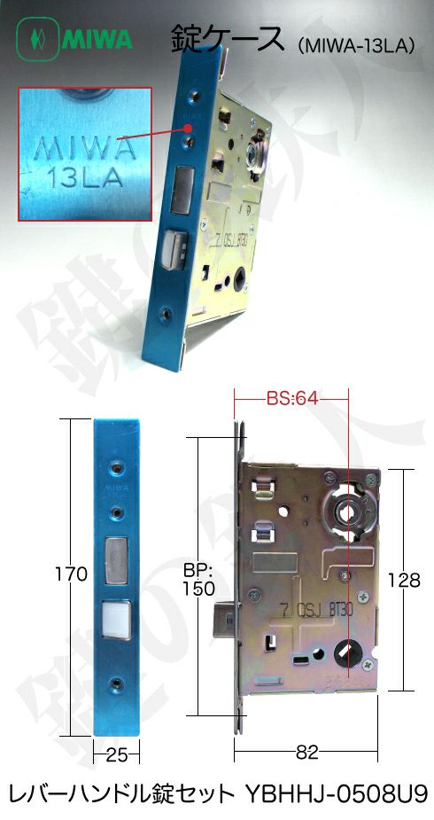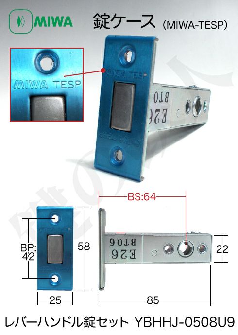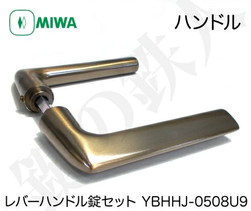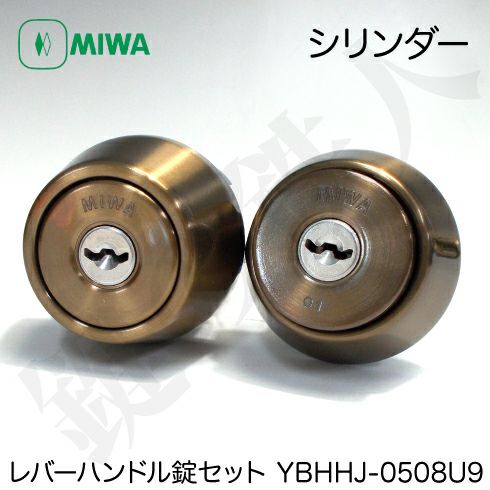 レバーハンドル内外、MIWA U9シリンダーと部屋内のサムターン、主錠の錠ケースと補助錠の錠ケース、飾り座(長座)付