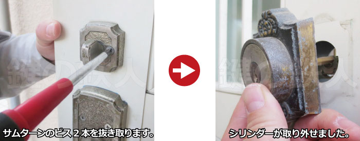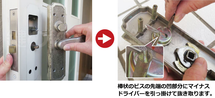 まず、補助錠(上側)から、ドライバーを使って部屋内側よりビスをゆるめて、シリンダーを取ってみましょう。