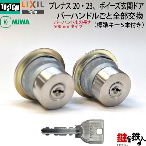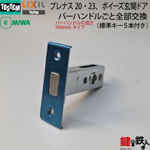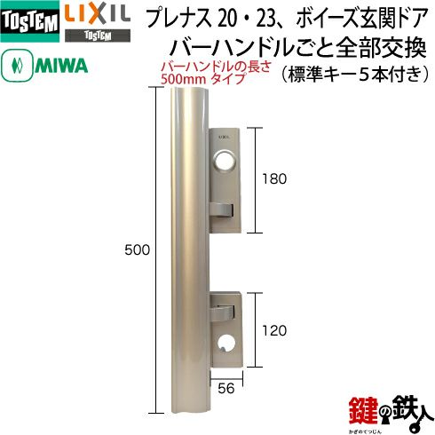トステム TOSTEM(=現 リクシル LIXIL) プレナス20・23、ボイーズ 玄関ドア バーハンドルごと全部交換 シルバー色 バーハンドルの長さ500mmタイプ