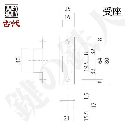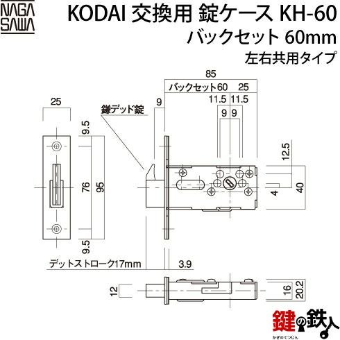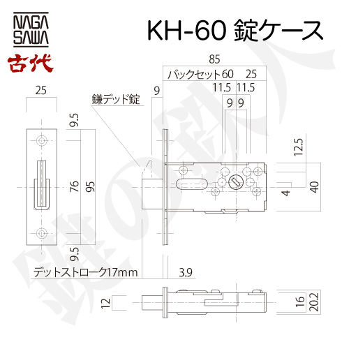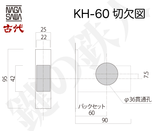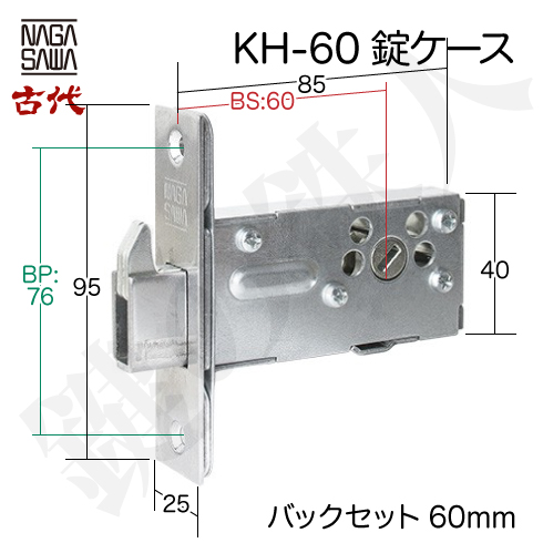 古代 本締錠用 鎌錠型 KH-60錠ケース バックセット60mmと受座