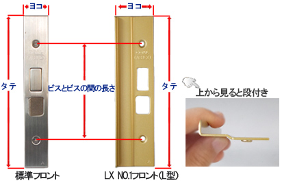 タテ=160mm、ヨコ=25mm、ビスとビスの間の長さ=105mmの場合は下図の1行2列目のフロント=LX No.6フロントとなります。