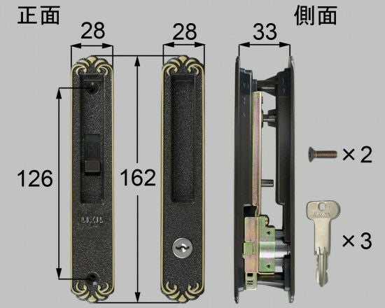 ・フロントサイズ=化粧座:147×34 ケース=102×17 ・ビスピッチ=化粧座:120 ケース:85 ・ドア厚=33~36 |
