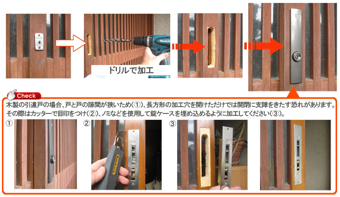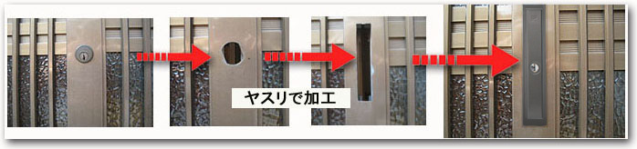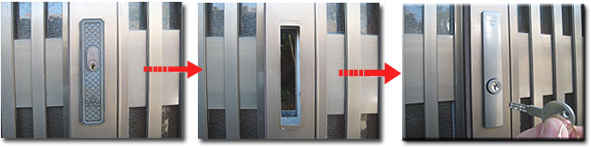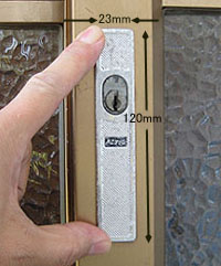 | 古い引戸錠です。 | ドライバー1本で外せます。 | ハイセキュリティ万能引戸錠に交換 |