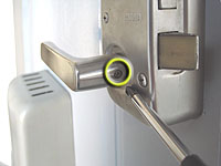 【1】部屋うちの方からまず、(レバーハンドル)を取外します。ノブのところをよく見ると、ボルトが見つかるはずです。ゆっくりと取外します。