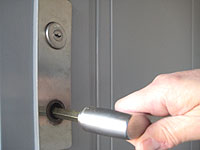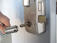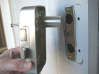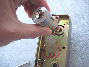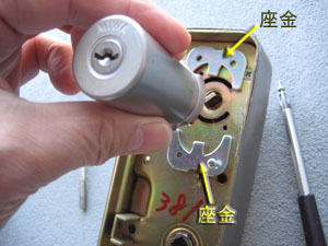 【5】3本のボルトが取れると、錠ケース本体が外れますので落ちないように気をつけて下さい。