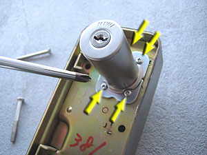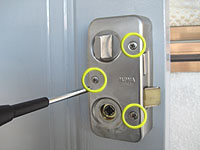 【4】次に、錠ケースを取外します。3本のボルトをゆっくりと取外します。