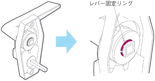 | 内締錠・表示錠のレバーハンドルは出荷時には右吊元用で出荷されますが、 左吊元用へのレバーハンドルの付け替え(レバーハンドルの向きの変更)が簡単にできます。 |
