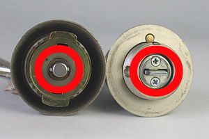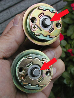 キーを挿し込んだ状態の従来のMIWAのシリンダー(左)と高性能シリンダー(右)の後ろの形を見比べてみます。MIWAのシリンダー(左)もキーを挿込むと高性能シリンダー(右)と同様の形状になり、カンヌキ(デッドボルト)の開閉が行われることがわかります。